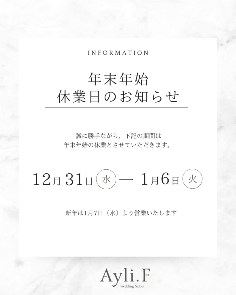 Wedding Salon Ayli.Fでは年末年始休業日を下記の通りとさせていただきます